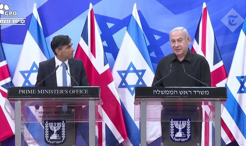 O primeiro-ministro britânico Rishi Sunak em coletiva junto com o primeiro-ministro israelense, Benjamin Netanyahu. (Captura de tela/YouTube/The Telegraph)