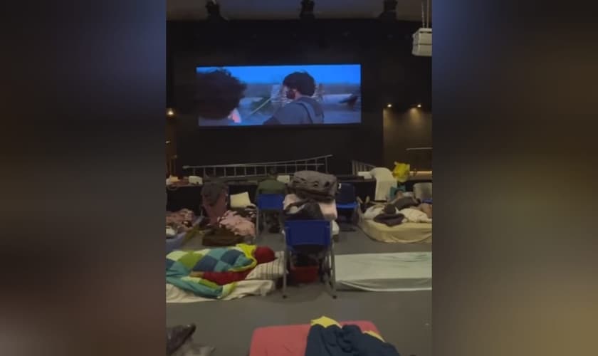 Abrigados assistindo “The Chosen”. (Foto: Reprodução/Instagram/The Chosen Brasil).