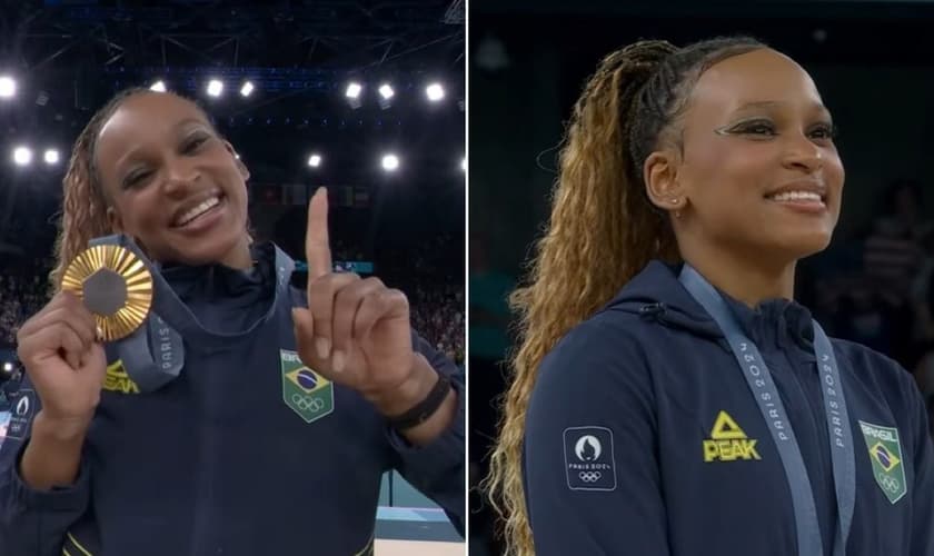Após conquistar o ouro na final do solo na manhã desta segunda-feira (5), na Bercy Arena, em Paris, e se tornar a maior medalhista do Brasil em todos os tempos, Rebeca Andrade creditou a vitória a Deus.