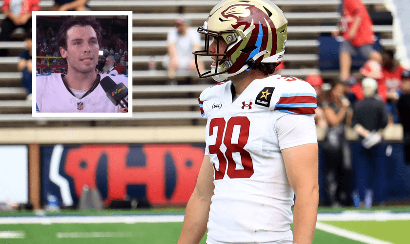 Jake Bates em campo; no destaque, durante entrevista sobre seu extraordinário desempenho. (Foto: Wikipedia/X)